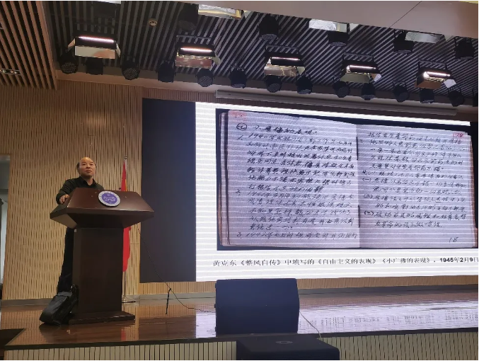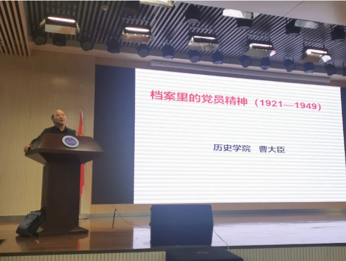 在热烈掌声中,曹教授开始了专题报告。曹老师从党员个人档案的形成和内容、档案里的党员人生、党员精神的凝聚与流传等三个方面分享他对档案里党员精神的理解。