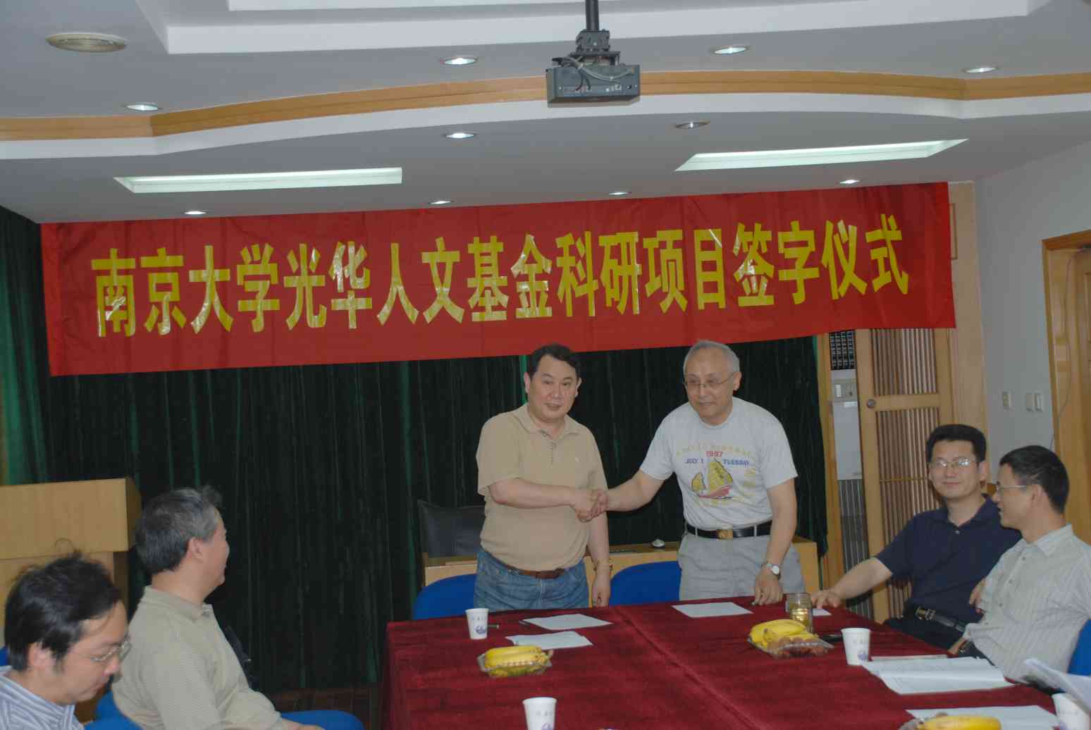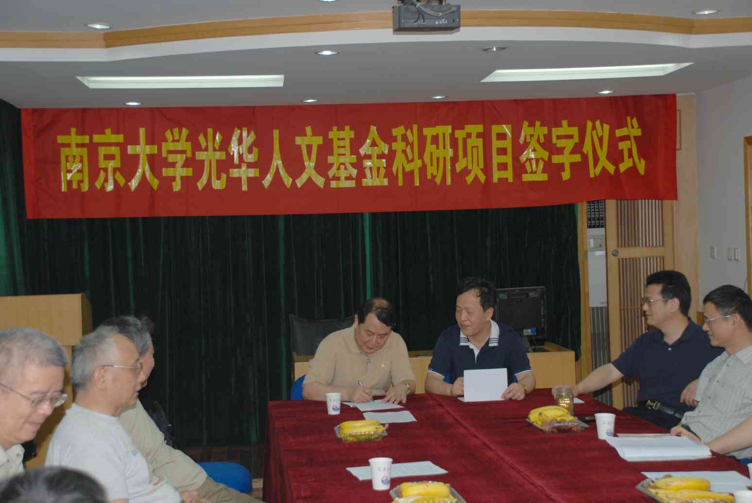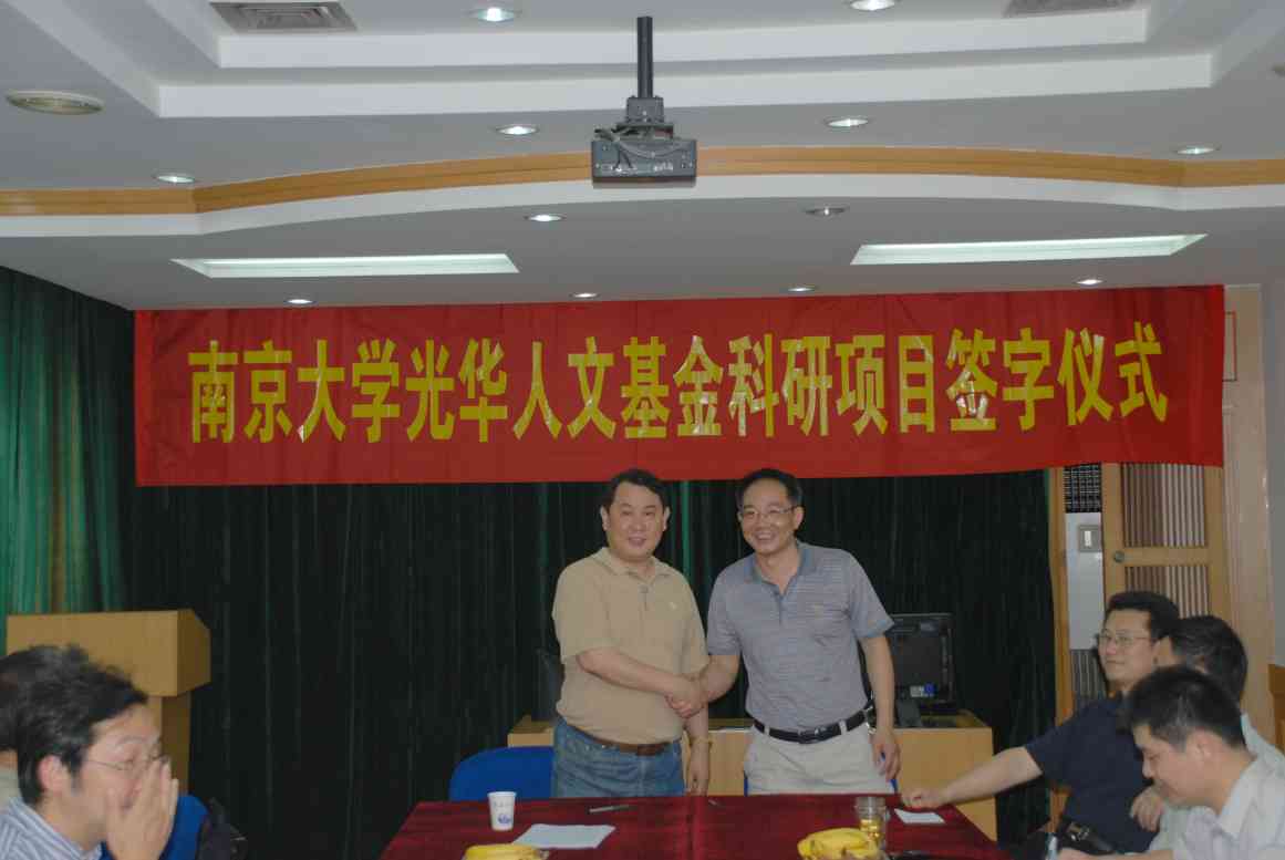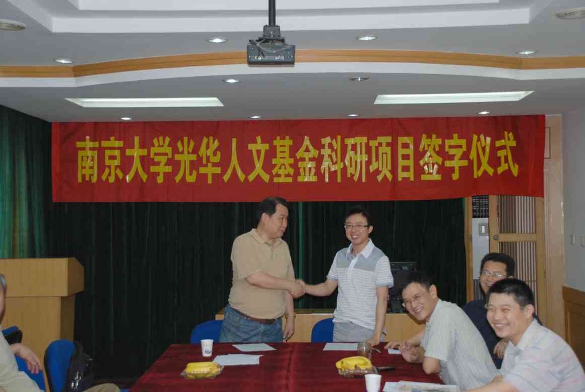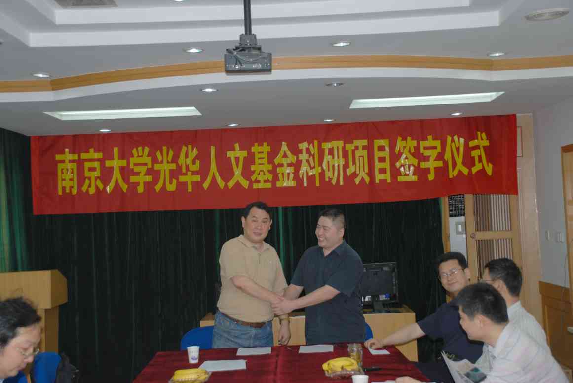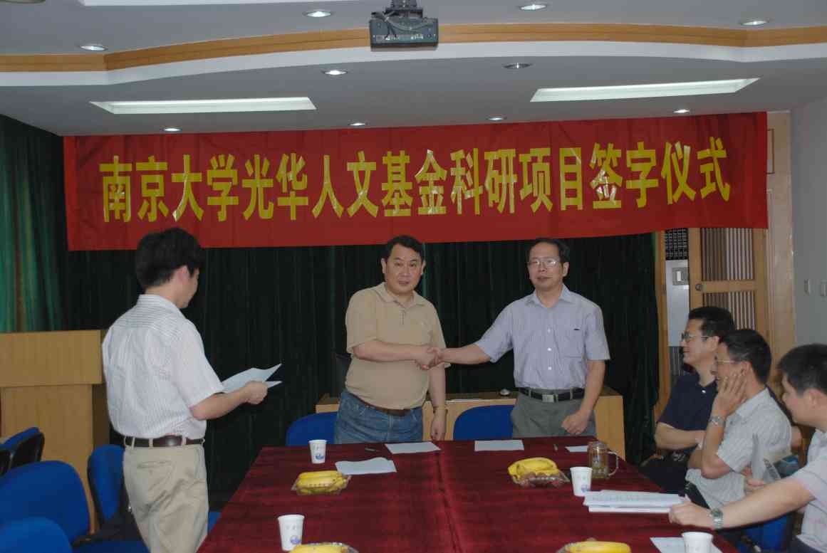 7月17日南京大学光华基金项目签约仪式在我系举行,系主任陈谦平教授和项目获得者一一签署合作协议。根据协议,项目获得者在3年的时间里将获6万元人民币的研究经费资助,集体项目3年将获得30万资助。这一举措将极大的激发广大教师的科研热情,大家也纷纷表示将会不辜负系领导和台湾光华基金会的希望,努力作出优异的成绩。出席仪式的还有我系党委书记孙江林、副主任水涛、计秋枫等。