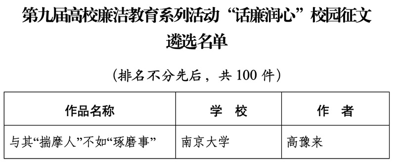 近日,在教育部第九届高校廉洁教育系列活动中,我院2022级中国史硕士生高豫来作品《与其“揣摩人”不如“琢磨事”》入选“话廉润心”校园征文全国百强遴选名单。