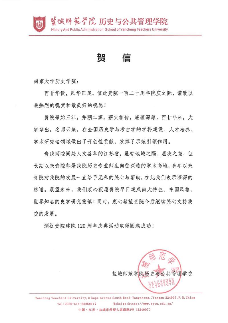 盐城师范学院历史与公共管理学院来信祝贺南京大学历史学科成立120周年