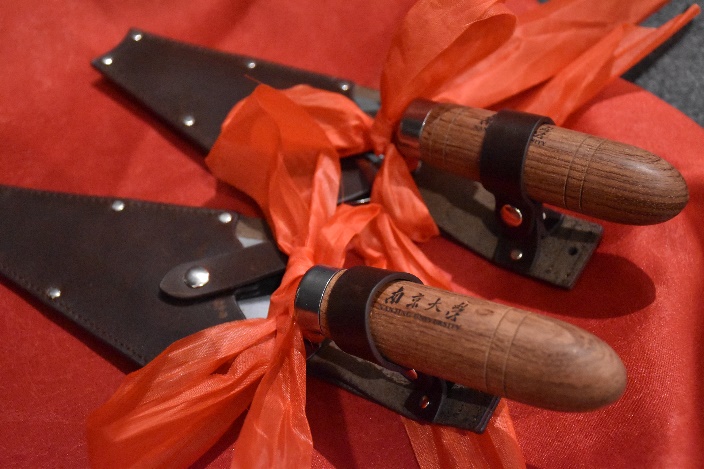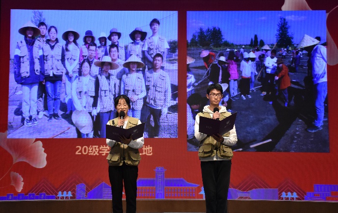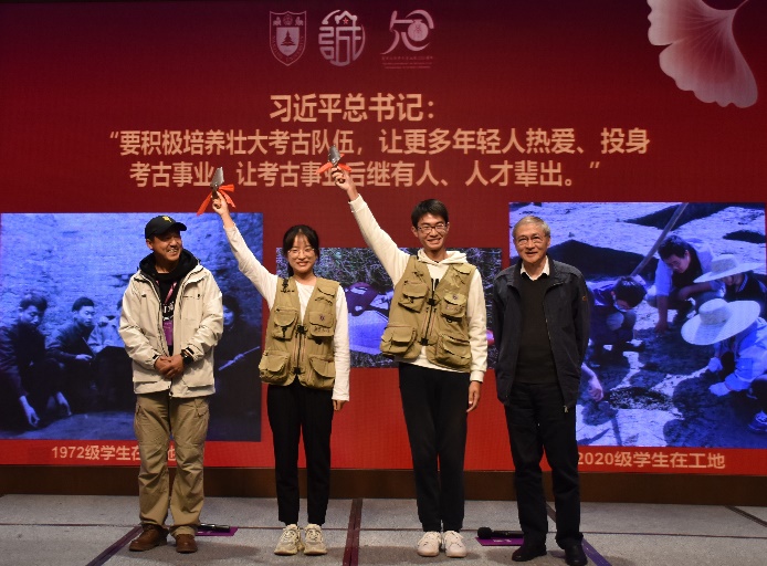 在校本科生代表张芊、龚晨宇献词。江苏省考古研究所原所长、南京博物院研究员,77级系友张敏老师、南京大学考古文物系主任助理张敬雷老师向学生代表颁赠手铲,勉励后辈学子日益精进,将南大考古学脉继承发扬。