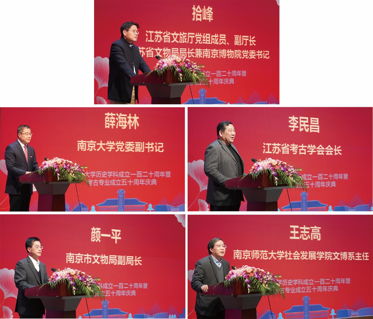 江苏省文化和旅游厅党组成员、副厅长,江苏省文物局局长兼南京博物院党委书记拾峰、江苏省文物局文保处处长李虎仁研究员、江苏省考古学会会长李民昌研究员、南京博物院副院长王奇志研究员、南京博物院副院长盛之翰研究员、南京市文物局副局长颜一平、南京市考古研究院书记赵薛灏、南京师范大学社会发展学院文博系主任王志高教授等嘉宾出席庆典并致辞。