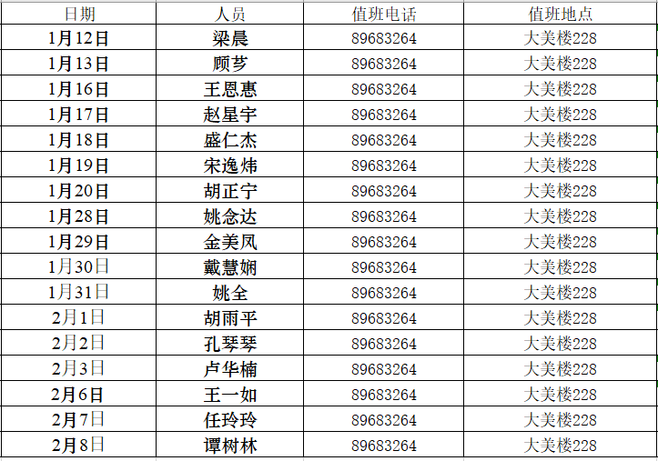 一、3044永利集团官网寒假工作领导小组组长:赵清、张生副组长:谭树林、任玲玲成员:梁晨、王涛、吴桂兵、胡正宁、张敬雷、李力、杨骏二、值班表值班时间:上午9:00-11:00,下午2:00-4:00。2月9日起正常上班。
