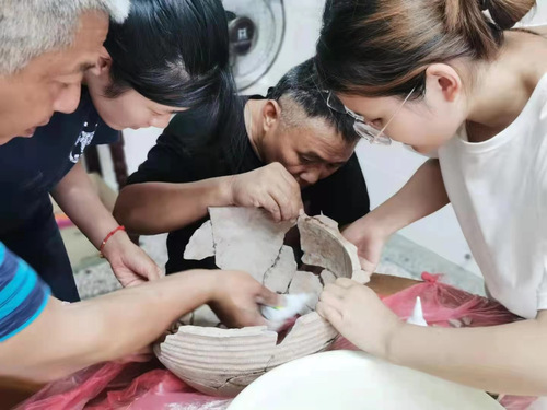 蒋秀如同学与老师同学们修复出土器物