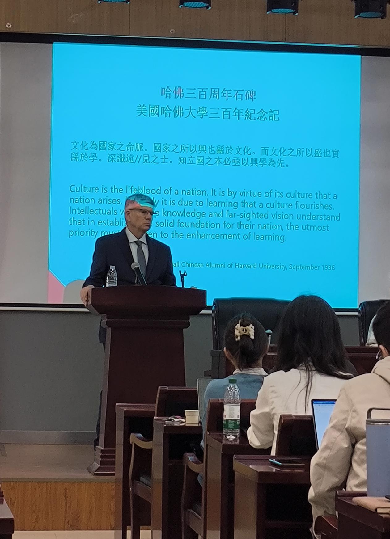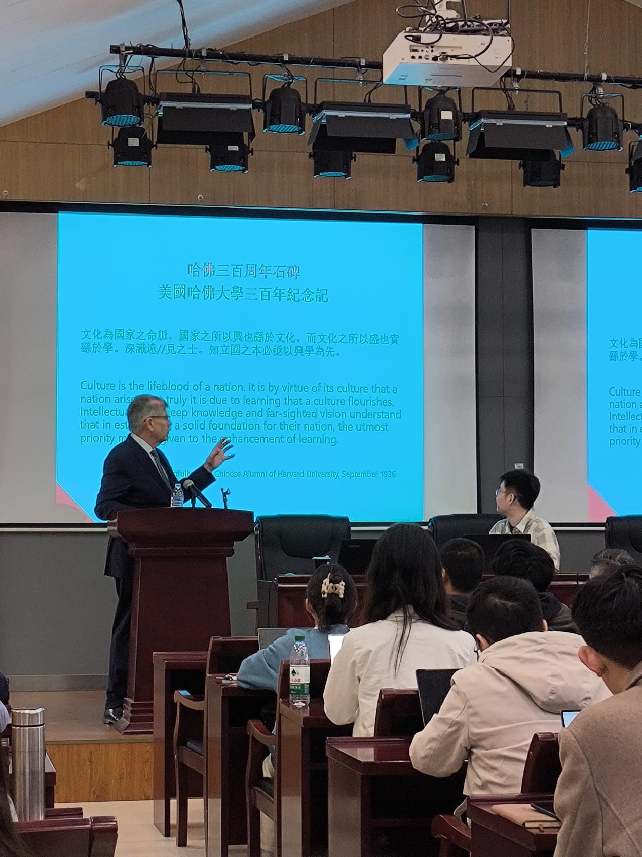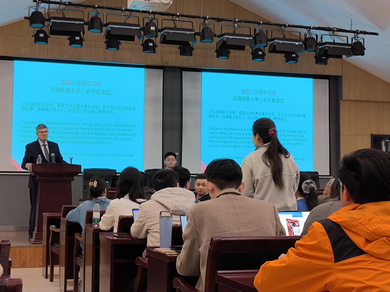 教育领域被柯伟林教授视为“中美关系的永恒主题”。他通过留美幼童、清华大学庚款办学等案例,阐释教育合作如何推动两国思想与技术的交流。其著作《顶尖大学的条件》(Empires of Ideas: Creating the Modern University from Germany to America to China)以南京大学北大楼为封面,彰显对中美学术联结的重视。柯伟林教授特别提到清华大学苏世民书院、南京大学中美文化研究中心及哈佛上海中心等跨国合作的实践,提出“教育不应该受到政治方面的影响”“教育与政治是相互分离的领域”。最后,柯伟林教授还展示了胡适在中国赠送的哈佛办学三百周年纪念石碑上关于教育事业意义的观点,进一步强调文化与学术对中美两国的意义。