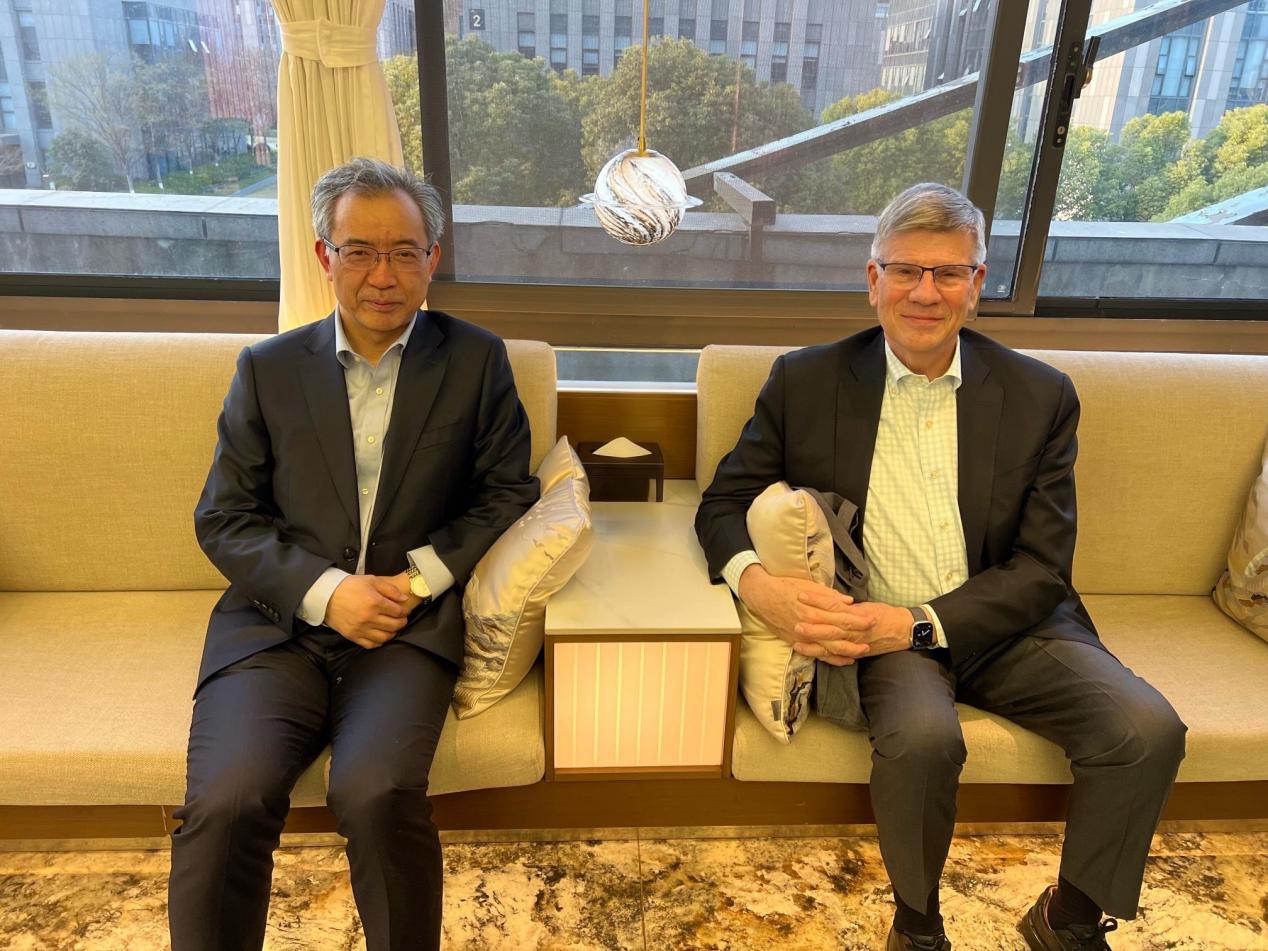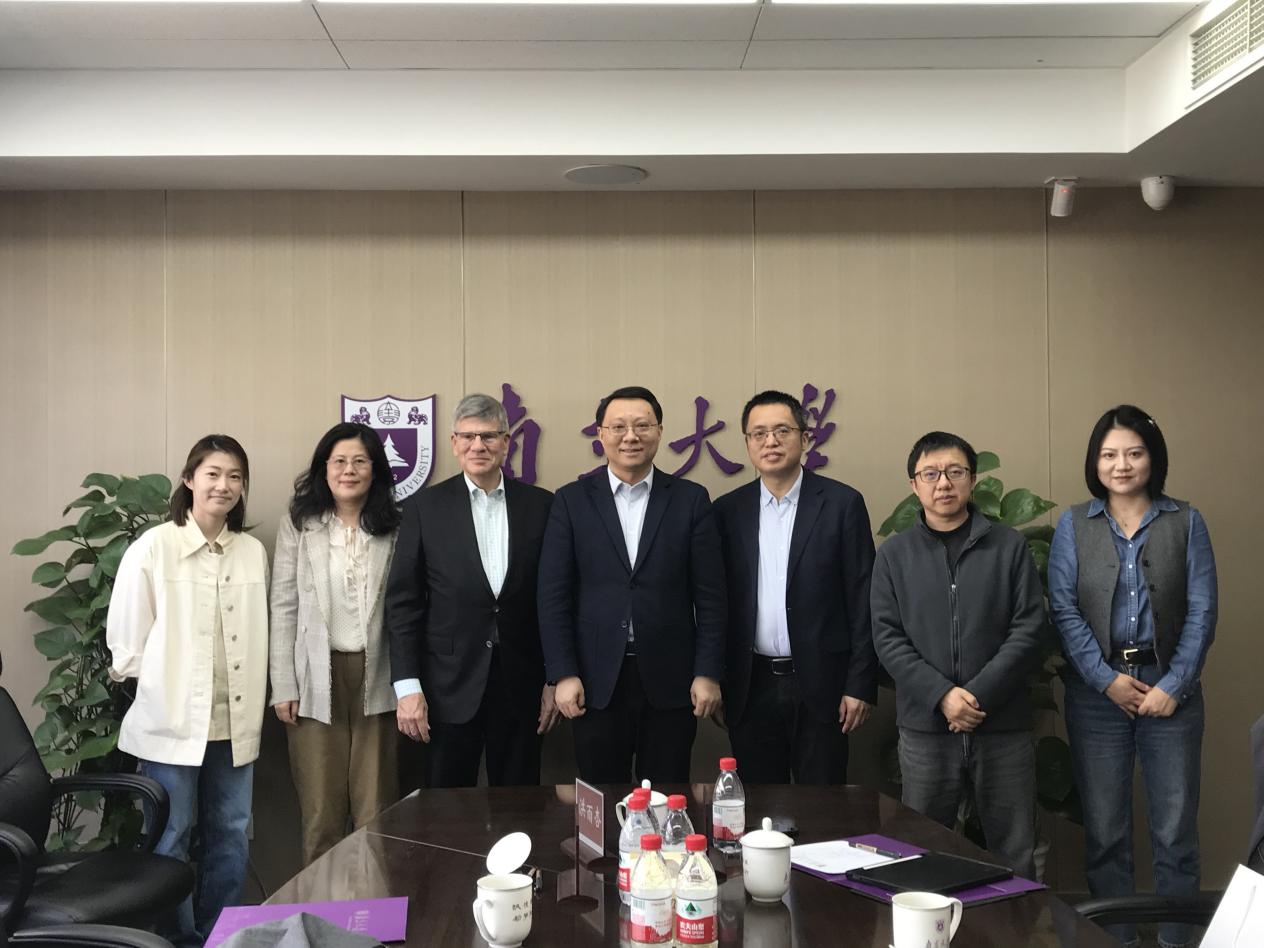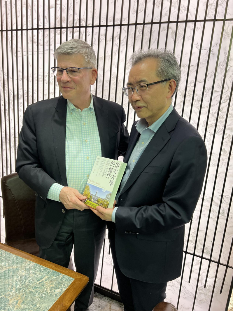 在来访期间,南京大学校长谈哲敏院士、党委副书记陈云松教授分别会见柯伟林教授,就两校合作展开深入探讨。谈哲敏校长向柯伟林教授简要介绍了我校的办学历史和发展情况,希望柯伟林教授继续关心南大历史学科的发展,支持南大与哈佛大学之间的合作。陈云松副书记对柯伟林教授为南京大学与哈佛大学交往作出的突出贡献表示衷心感谢,强调中美关系走到了一个微妙的十字路口,亟需专业学者的“布道”,解除误会,并提出双方合作,共同设计一门高水平国际化通识课程的构想。柯伟林教授对此提议表示认可,他高度重视南京大学在中美交流中的意义,此次来访是他首次在南京大学开展有关中美关系的讲座。柯伟林教授还以他在哈佛大学开设的通识课程《美国和中国》为例,建议该国际化通识课程融合两校优势资源,聚焦历史与当代中美交往的具体案例,邀请历史事件中的亲历者参与教学,结合回忆录、口述材料、报刊、学术研究及政府公报等史料,通过课堂辩论、嘉宾讲座等形式,引导学生深入理解中美关系的复杂性与合作潜力。双方就推进两校学术合作、共建国际化高水平通识课程达成重要共识,计划组建联合教研团队,推动师生互访、合作研究及教材开发,致力于将课程打造为国际化通识教育的典范。会见期间,柯伟林教授向谈哲敏校长赠送了其最新学术专著,彰显双方学术互鉴的诚意。