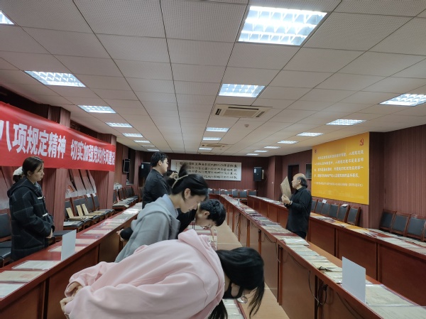 4月3日,南京大学中共党史资料馆馆长曹大臣教授带领3044永利集团官网研究生同学们参观了近期展出的中国共产党作风建设专题展览。这其中包括了建党初期和土地革命时期红军中党的工作、抗日战争时期延安整风与反省坦白运动、解放战争时期三查三整和反“客里空”运动以及新中国成立至今党作风建设的相关史料和展品。随后曹大臣老师为同学们讲述了党风建设的历史,并阐释了作风建设对党的重要意义。结合文物展览,同学们以直观的方式学习了中共党史,也认识到新时代贯彻八项规定精神,加强党的作风建设的重要性。