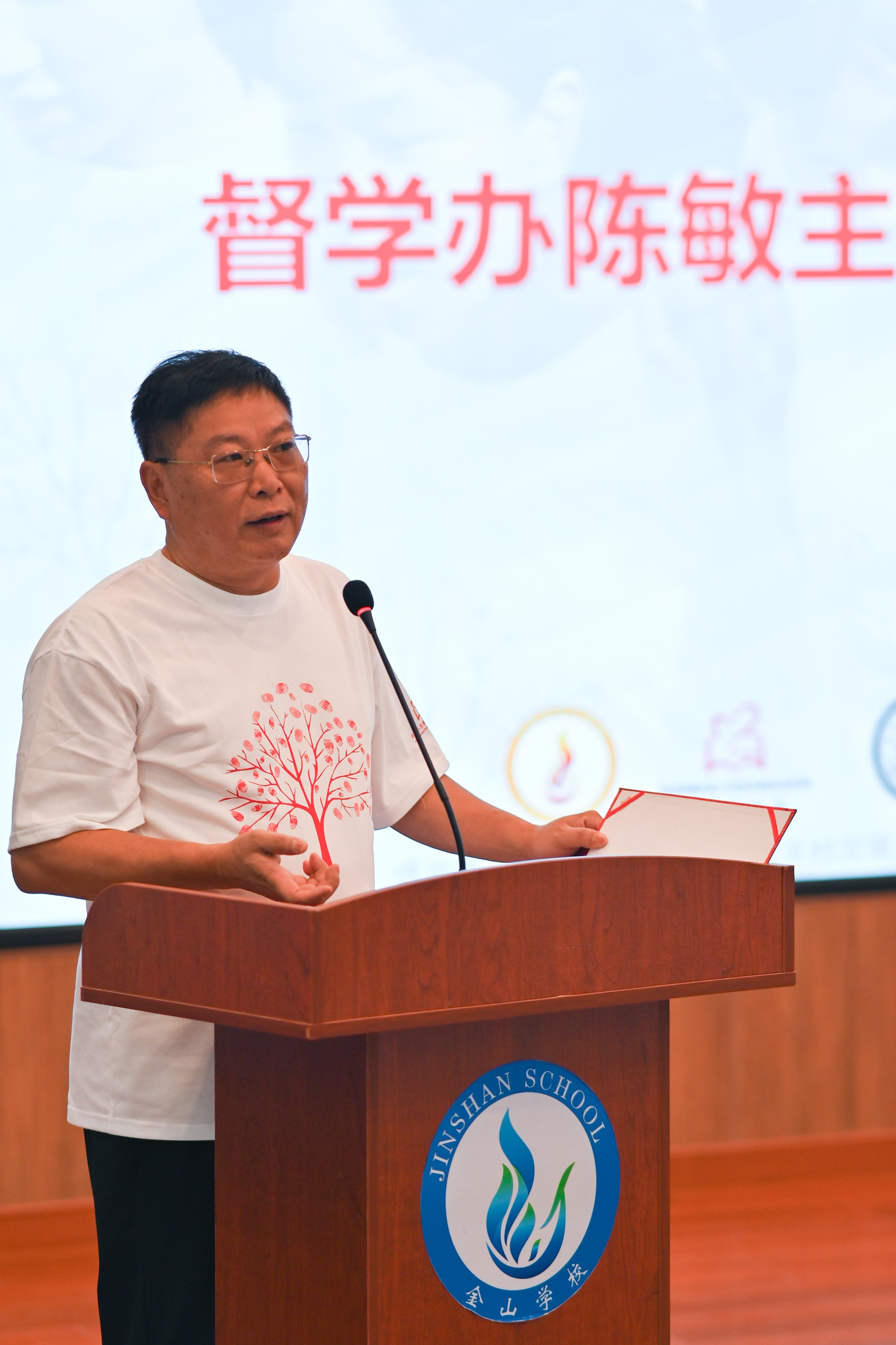 金山学校向明珠副校长为训练营的前期准备提供了细致的关切和鼎力的支持,她在致辞中表达了对于全体训练营营员的祝福与期待,她强调金山学子应互助友爱、尊敬师长、努力学习、快乐生活,也祝愿暑期训练营活动圆满成功。