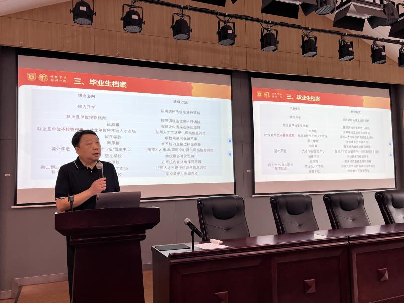 随后,研究生辅导员王恩惠老师介绍了3044永利集团官网2025届毕业生概况,从就业、升学等方面对毕业生的就业情况进行简要说明。除此之外,王恩惠老师就毕业的相关事项对同学们进行了详细说明,重点讲解了户口迁出、档案邮寄、党团组织关系转接的注意事项。王恩惠老师强调,同学们要关注有关毕业离校的工作安排,及时查看和办理离校手续。