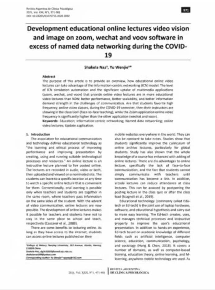 日前,我院于文杰教授和2017级博士生沙卡拉·纳兹(Shakala Naz)合作的文章在《Revista Argentina de Clínica Psicológica》杂志上发表了题为《Development educational online lectures video vision and image on zoom, wechat and voov software in excess of named data networking during the COVID-19》的文章,在国内外教育与学术界产生较大反响。