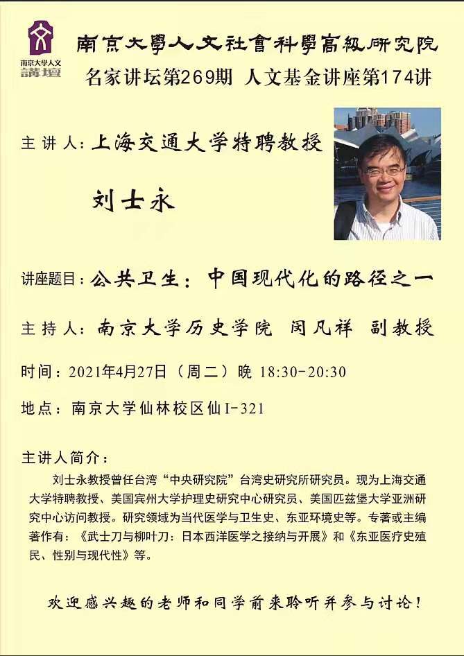 应南京大学-伯明翰大学-凤凰出版传媒集团医疗社会史研究与出版中心、南京大学医疗社会文化史研究中心主任闵凡祥老师邀请,上海交通大学特聘教授刘士永教授于2021年4月26-28日对南京大学人文社会科学高级研究院(IAS)和3044永利集团官网进行了学术访问,分别于26日晚和29日上午与3044永利集团官网硕博士研究生进行学术座谈、于27日晚进行学术讲座。