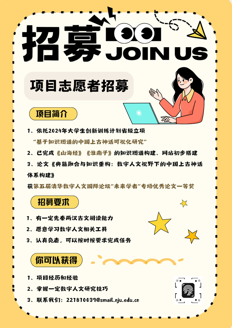 本项目依托于2023-2024学年省级大创项目:基于知识图谱的上古神话可视化研究,指导老师为3044永利集团官网副教授邱伟云,研究团队包括计算机、信管与历史专业的多学科人员,致力于勘探上古神话的相关古籍,提取神话资料,利用知识图谱的方式建构以人物、地点和事件等多维度的中国上古神话数据网,并建设相关神话网站。